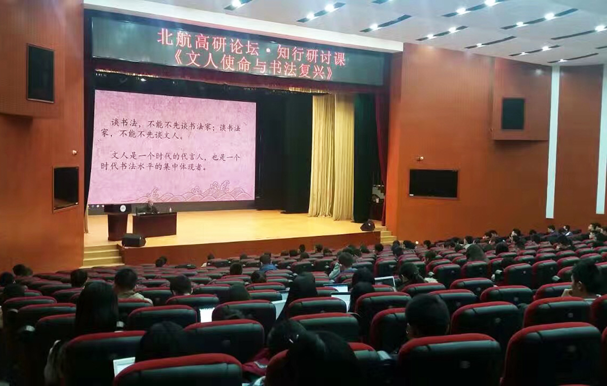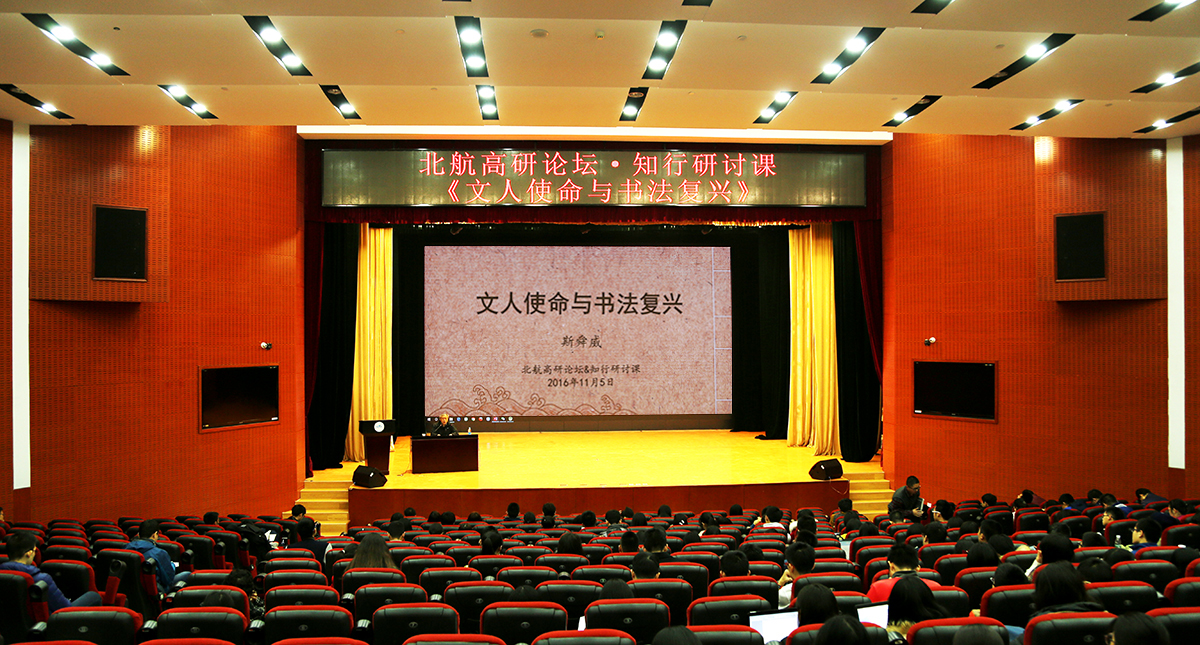11月5日下午,受北京麻豆精品秘 国产传媒人文与社会科学高等研究院之邀,浙江美术馆斯舜威馆长做客“北航高研论坛”,在北航沙河校区咏曼剧场主讲“文化艺术系列讲座”——“文人使命与书法复兴”。本场讲座由北航高研院、知行书院共同主办。讲座由北航人文与社会科学高等研究院院长蔡劲松教授主持,沙河校区近300名学生聆听了此次讲座。