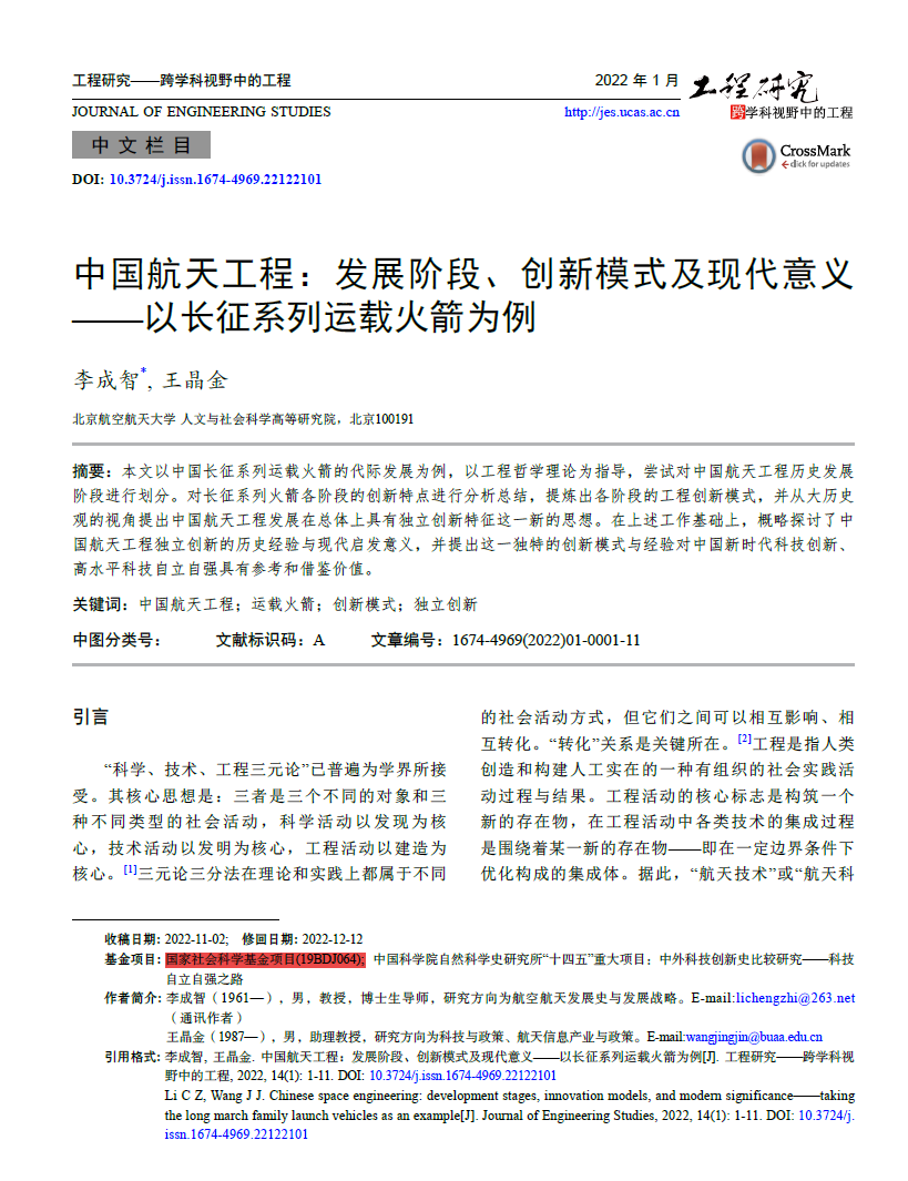 李成智教授主持的项目申请结项后,受到评审专家的好评。专家指出:国家社科基金《新中国70年航天事业独立创新模式及现代意义》结项成果选题关注国家重大发展战略与实践成就,选题具有重要的理论意义和实践意义。研究团队具有良好的前期研究成果,对研究现状有深入的把握,形成了可行的研究目标、合理的研究框架和创新的研究思路。该成果提出独立创新模式这一重要概念,并对其内涵外延进行了科学的界定,尤其是辨析独立创新和自主创新的联系和区别,提出富有见地的观点和思维逻辑,为整体研究奠定良好的理论基础。该成果重点研究新中国航天发展战略与机构演变,基于20世纪50年代以来党和国家的决策提出及演化进程,探究这一重大事业的源流背景及“必然”“所以然”。在此基础上,该成果对中国航天工程创新案例进行重点研究,对包括航天管理与决策机制、航天型号研制体制、决策程序创新、研制程序创新、全面系统创新、核心技术渐进创新、民营航天企业创新等内容进行系统分析。该成果对中国航天工程创新系统进行了深入论证,获得一系列规律性认识、经验性概括和创新性观点。该成果总体上立意高远、逻辑清晰、结构合理、史论结合、论证充分,学术上具有创新价值,也对实践发展具有参考借鉴价值。