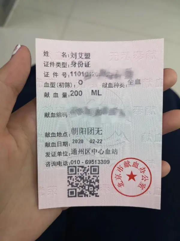 2月22日,刘艾盟来到预约的朝阳区中心血站献血。虽然是第一次献血,但护士们的热情接待以及共同参与献血的爱心人士让刘艾盟觉得并不孤单。“献血时间不算长,也并没有我想象中那么可怕。当接到献血证明时,我为自己的贡献感到欣慰,也为自己的勇气而感到骄傲。”在这次难忘的献血经历后,刘同学还表示今后依然会不定时地参加无偿献血活动,希望自己的力量能够帮助到需要的人们,也真诚地期盼疫情早日结束。