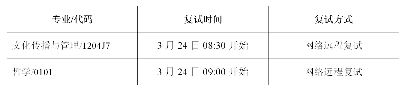 注:(1)学院定于3月23日进行复试系统测试,具体测试时间和要求当日会以短信或电话形式提前通知到考生。(2)考生具体复试顺序将随机抽取确定,复试前会以短信形式通知到考生,同时在候考区公布,请考生保持手机开机状态注意查收,未接到通知者请及时与学院联系。(3)所有考生提前10分钟进入复试待考区候考,进入复试现场时,一律不得携带复试规定以外与复试无关的任何物品,否则以违规处理。